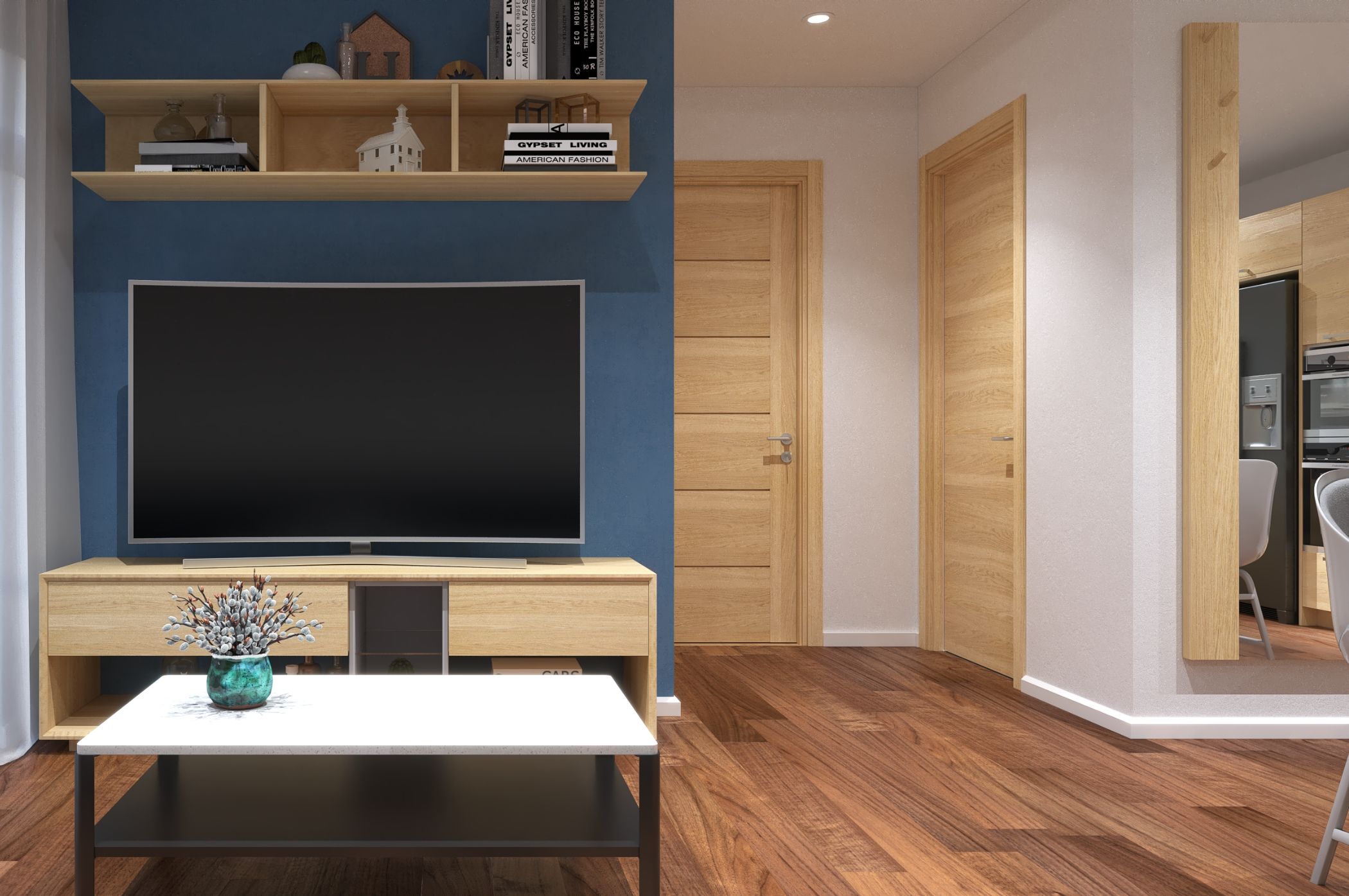 Với phòng ngủ chính dành cho người lớn, các gam màu xám của tường luôn giữ vai trò chủ đạo, đặc biệt khi kết hợp cùng chất liệu gỗ nâu tông đậm trên sàn nhà sẽ tạo ra một sự ấm cúng và gần gũi đến lạ thường. Không gian phòng khách của nội thất căn hộ chung cư 2 phòng ngủ sẽ được bài trí theo phong cách tối giản nhằm mang lại sự thông thoáng.