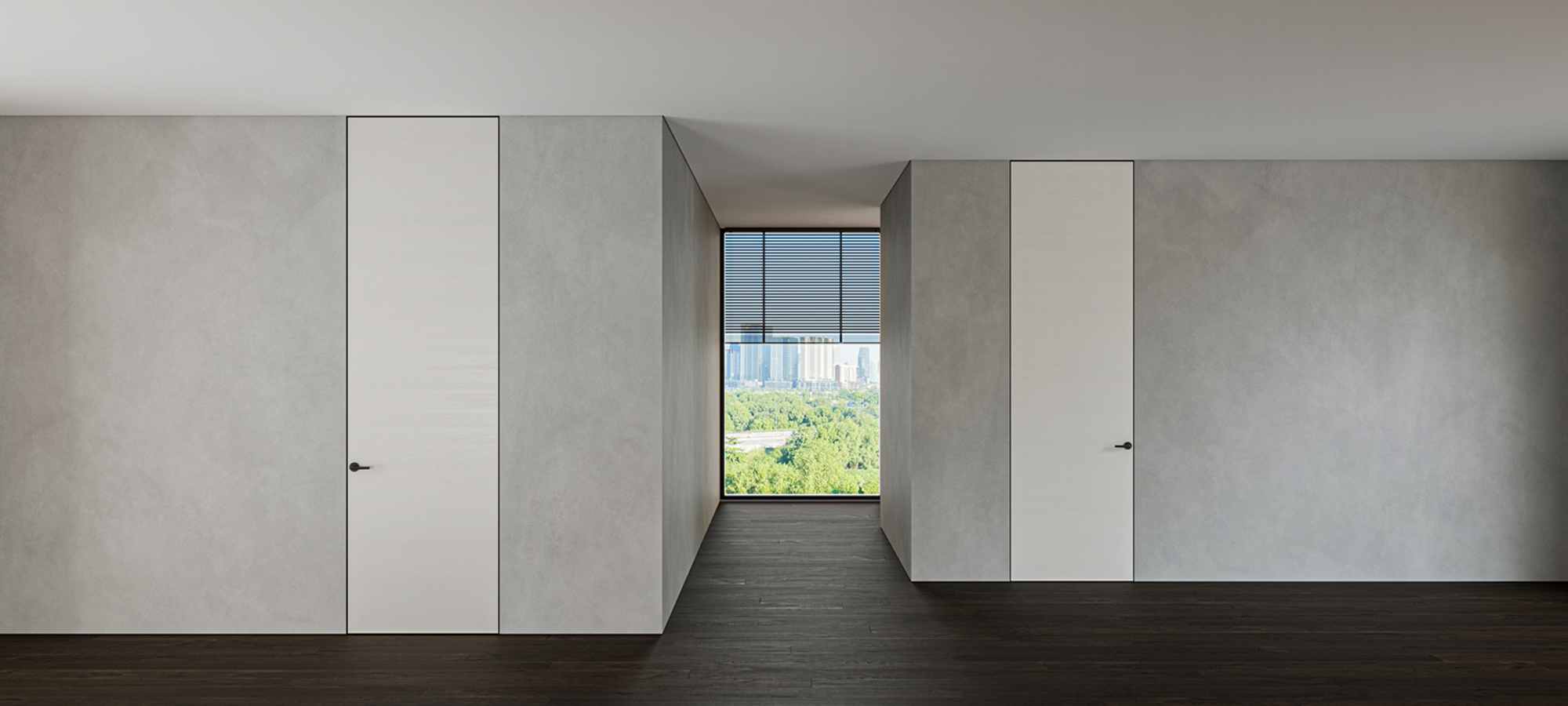 The design eliminates the traditional visible jamb and uses an in-wall aluminum frame paired with a luxurious natural wood veneer surface. The result is refined, discreet, and rich in visual depth.